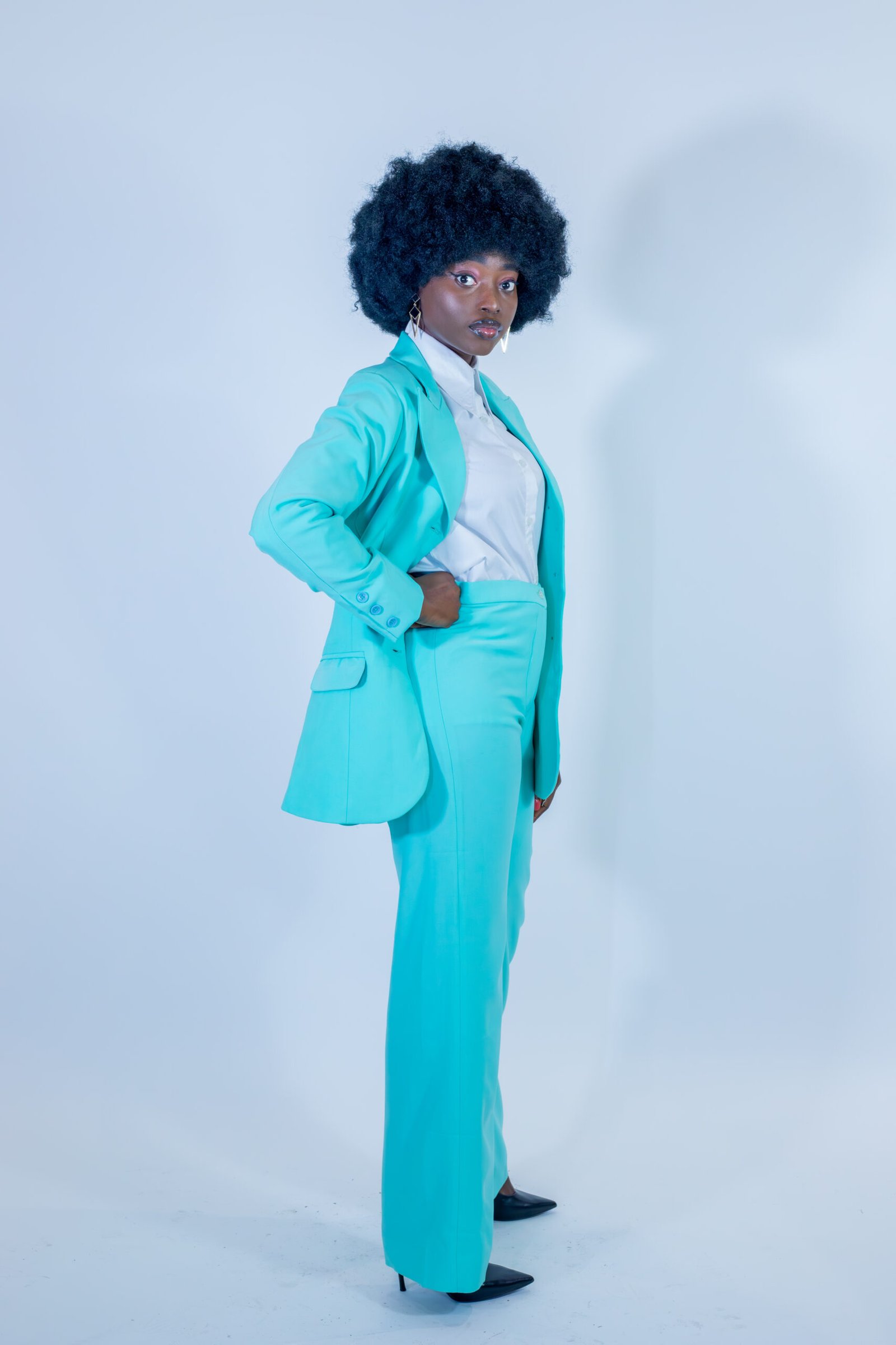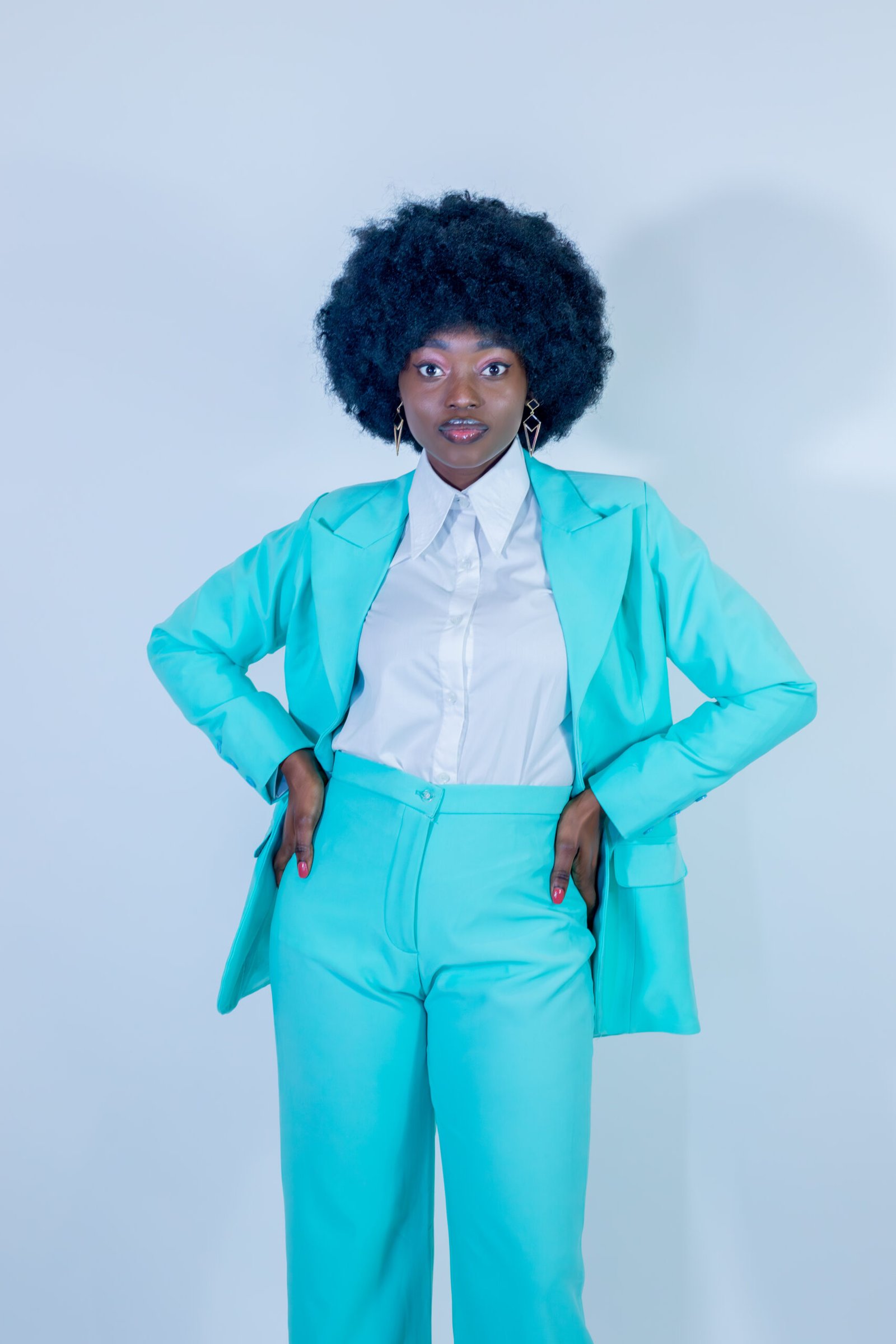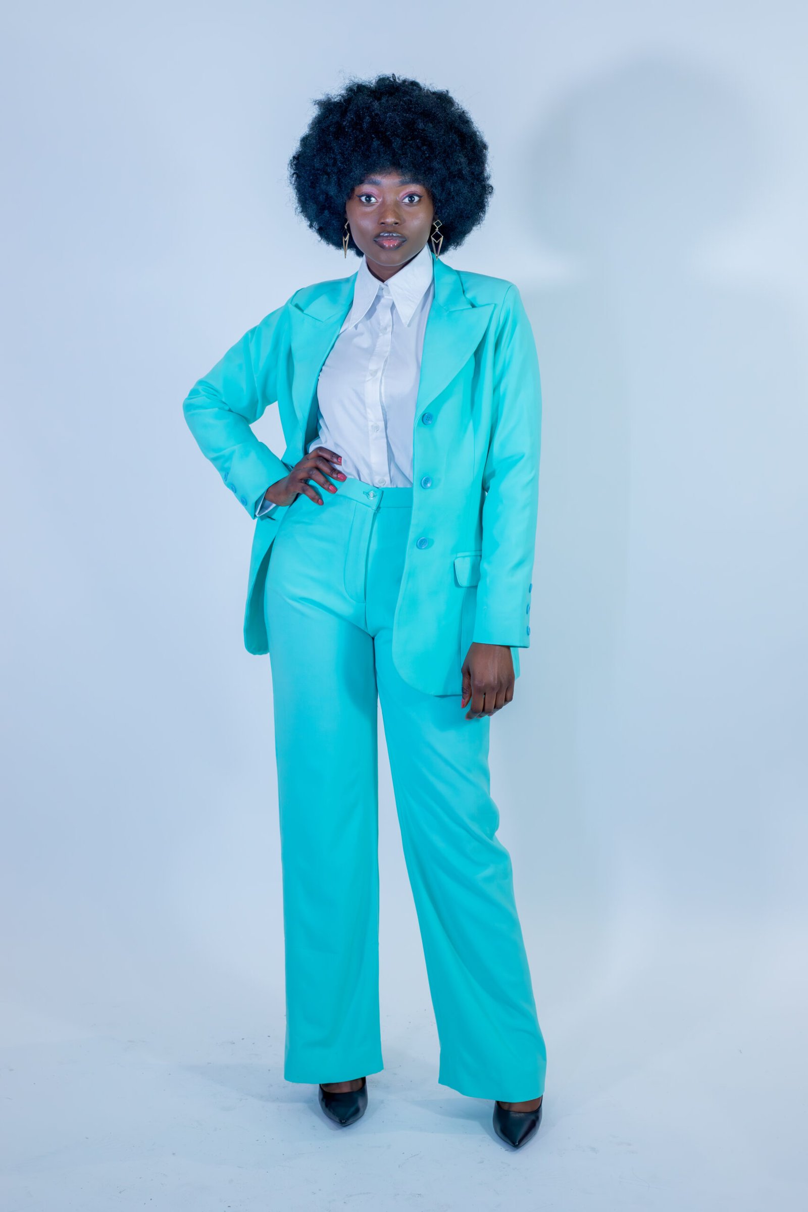 Un ensemble tailleur turquoise qui insuffle fraîcheur, leadership et distinction dans chaque mouvement.