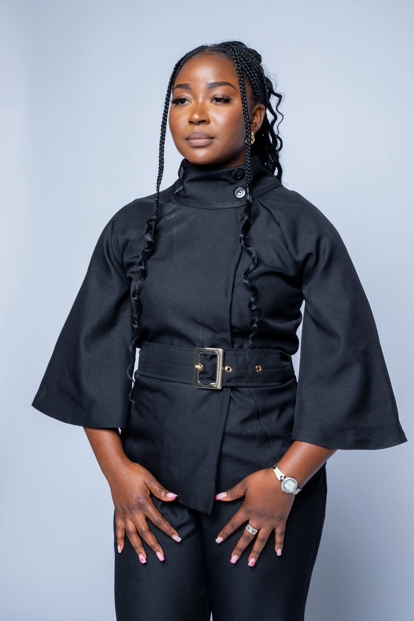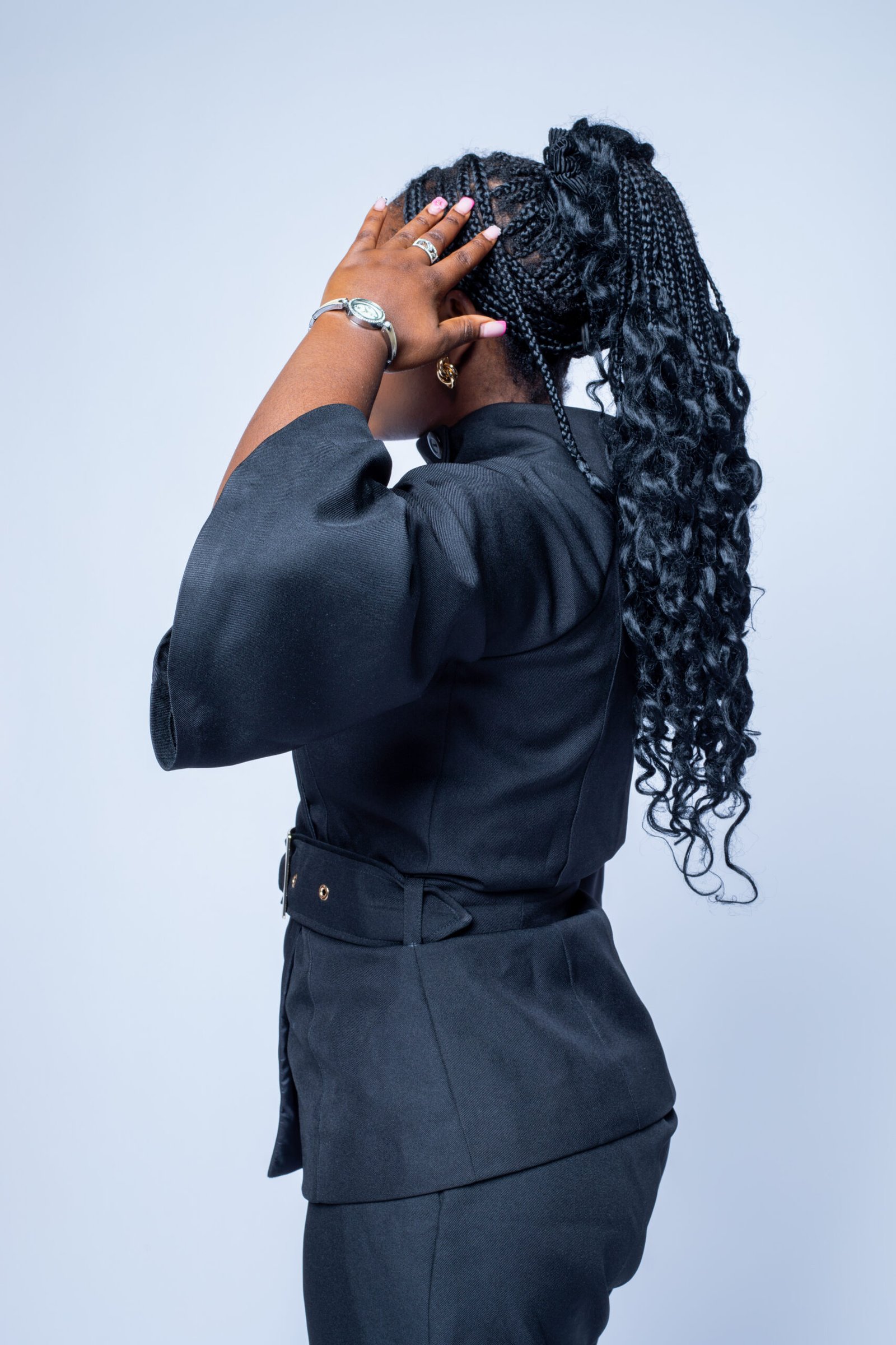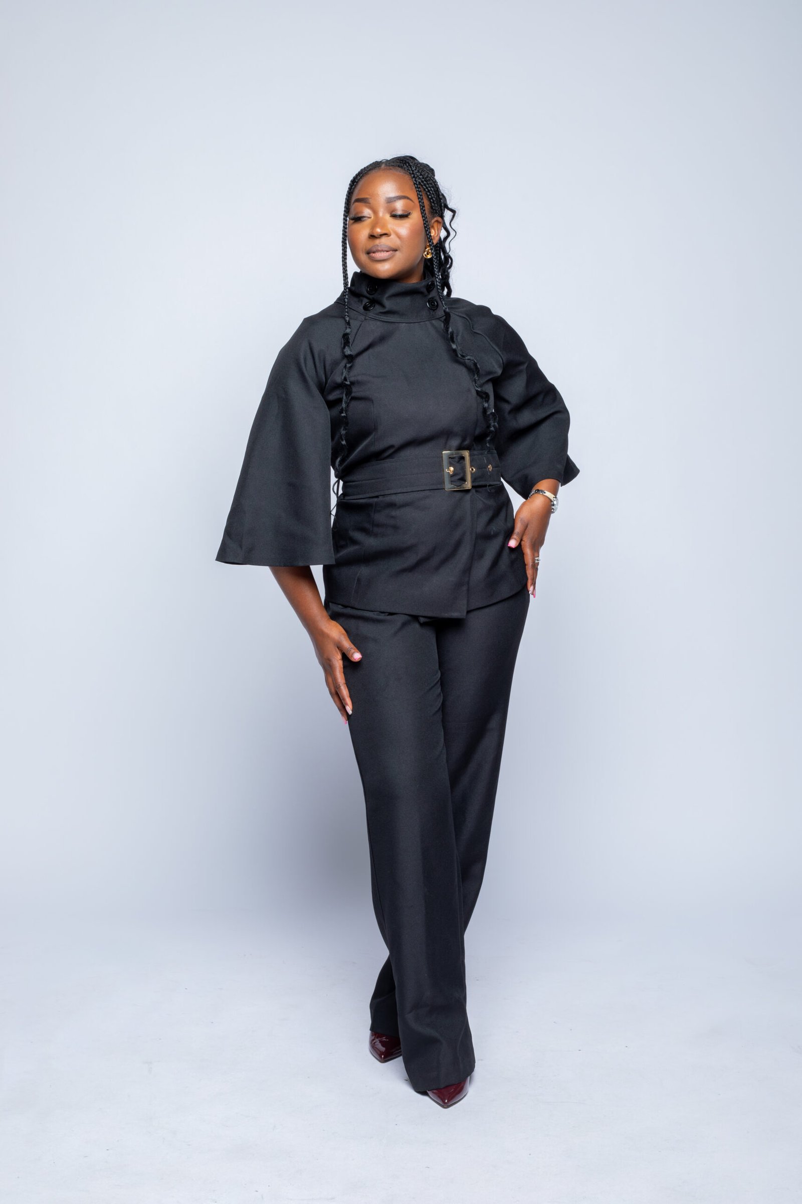 Sculpté dans un noir profond, l’ensemble Reine Abigaïl réinvente l’élégance royale avec sa coupe affirmée, son col montant sophistiqué et ses manches évasées. Une pièce forte pour la femme qui avance avec assurance, intelligence et prestance.