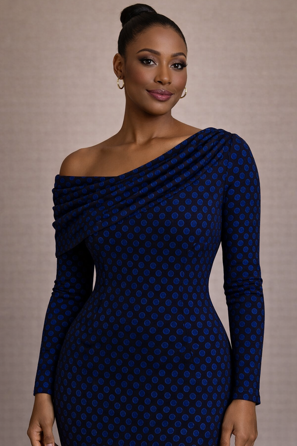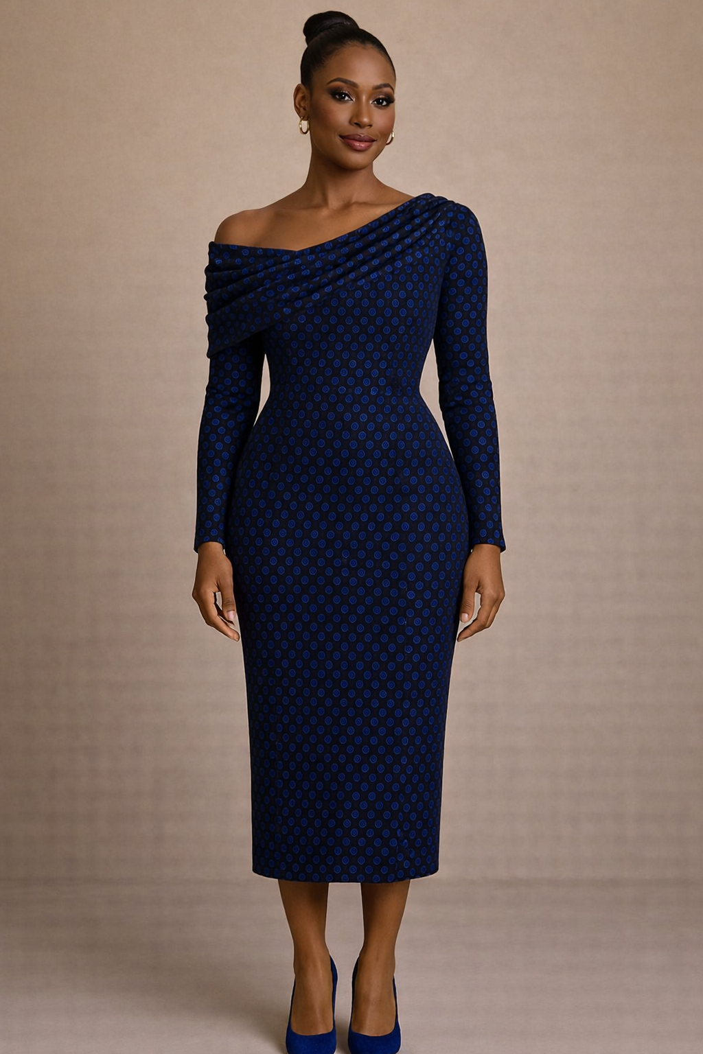 La Robe Commandante Myriam est une robe midi asymétrique en brocart tissé, pensée pour structurer la silhouette avec puissance et distinction. Son épaule dégagée, son drapé maîtrisé et son motif bleu roi subtil dessinent une allure affirmée, moderne et souveraine. Une pièce d’autorité élégante pour la femme qui avance avec vision et assurance.