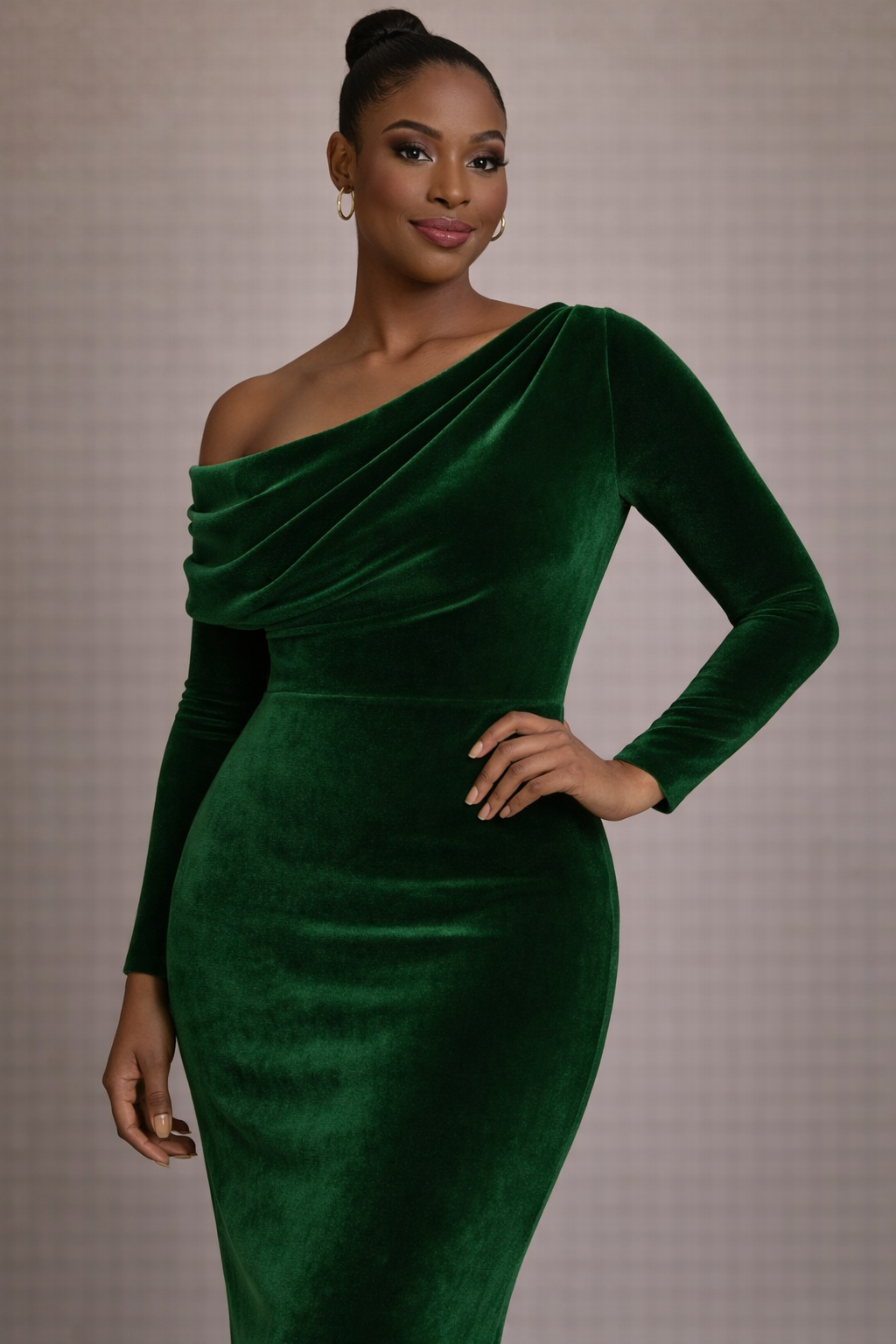 La Robe Reine Hadassah est une robe midi asymétrique en velours de soie vert profond, conçue pour sublimer la silhouette avec noblesse et maîtrise. Son drapé épaule fluide et sa coupe structurée dessinent une allure souveraine, raffinée et intemporelle. Une pièce d’exception pour la femme qui gouverne par sa présence et son calme intérieur.