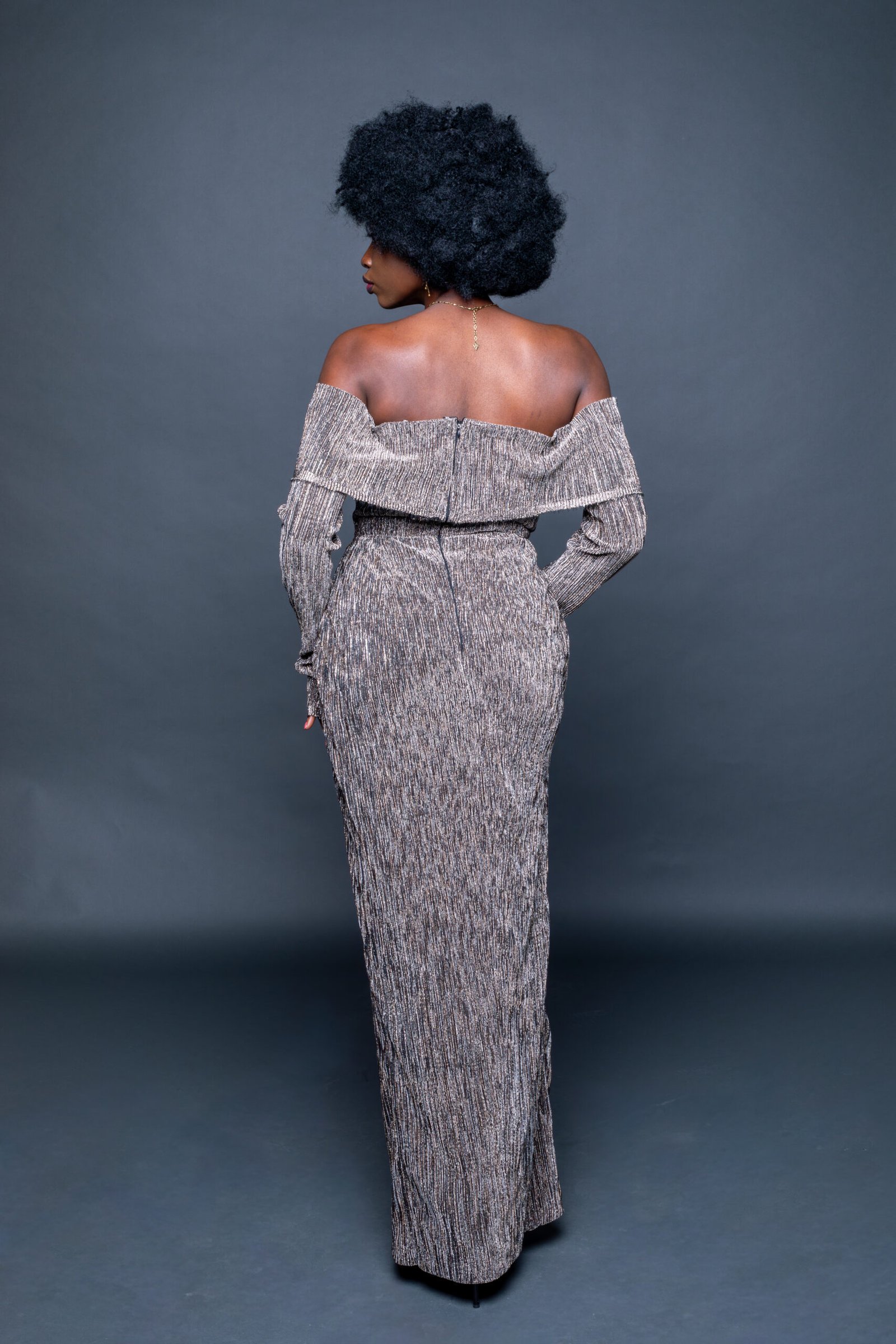 La robe Grandeur Absolue enveloppe la silhouette d’une allure souveraine : une coupe sirène fluide, des épaules dénudées majestueuses et un drapé raffiné qui souligne la prestance naturelle de celle qui la porte.